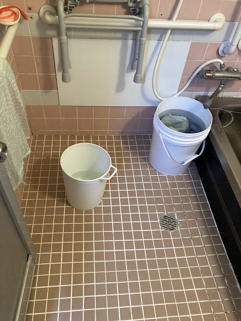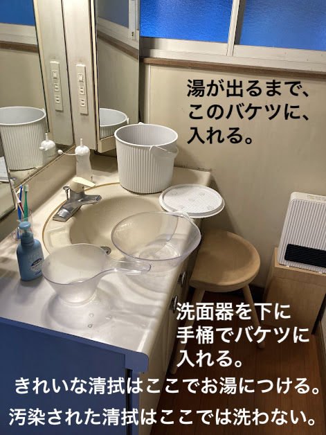 - 大規模な排便漏れ、排尿漏れ、水のこぼしは、清拭で。