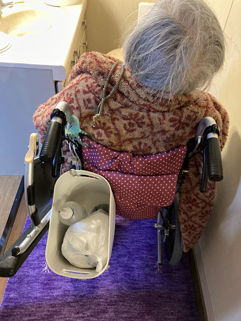 - 汚染されたパットが入った白いケースが車椅子についた状態で、台所に入らないこと。