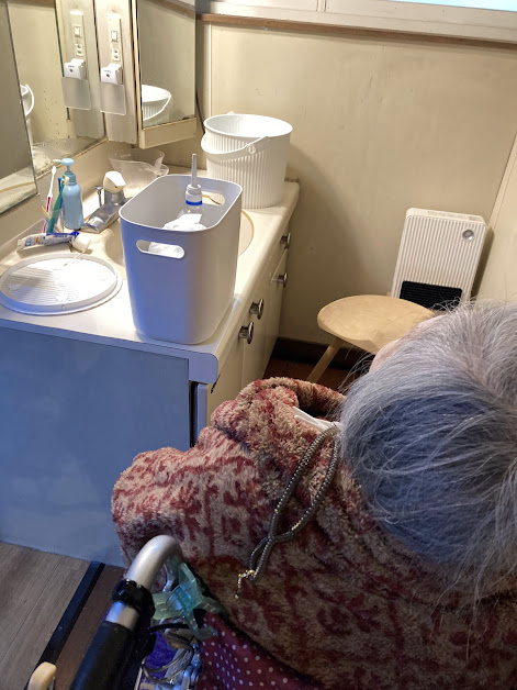- コップは、プラスティックが基本。手が不自由なので、コップに水が残った場合は、本人から離して、触らない距離においてください。近いと、だいたいこぼして、衣服が濡れてるので。