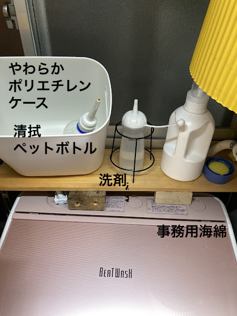 ティッシュを水で濡らして、卓上の白いスプレーが水