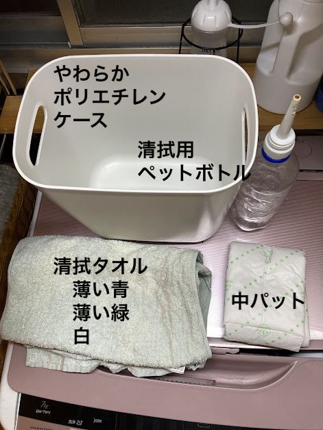 排便日当日と翌日は、特に汚染されている衣類や清拭があるので、それらとは分けてください。当日説明します。だいたい月曜か火曜の朝です。